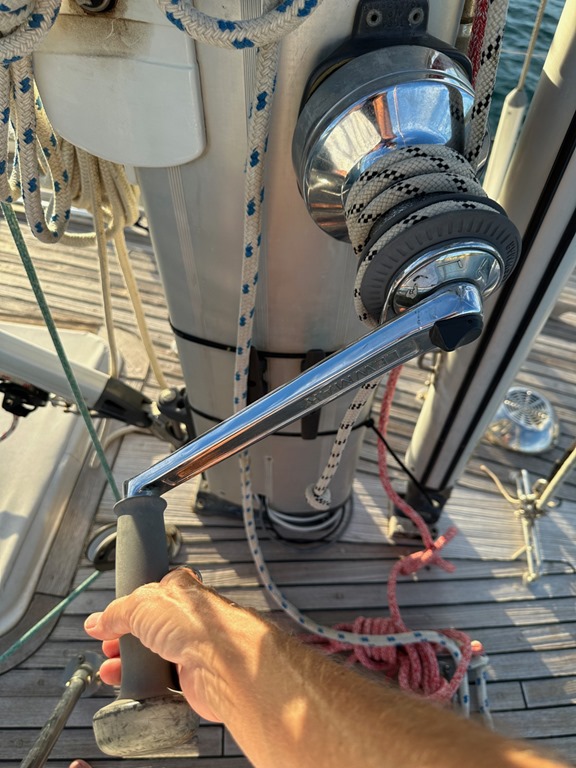 taking down the headsail on a low-wind morning,