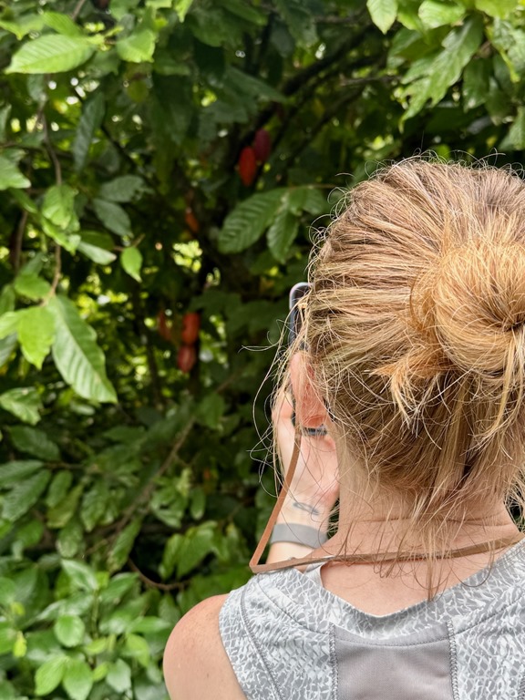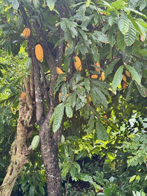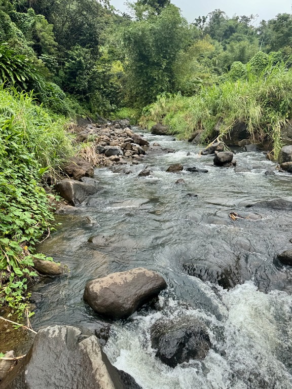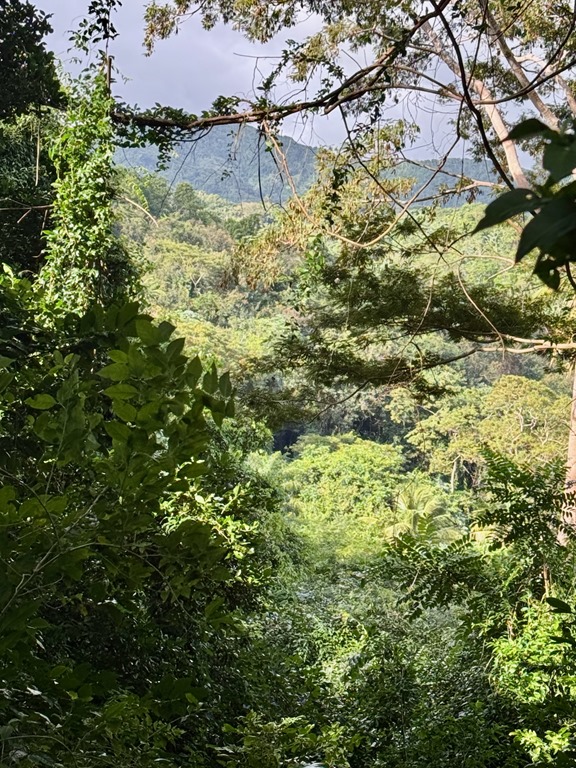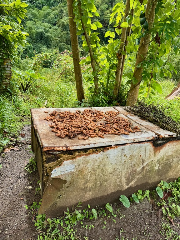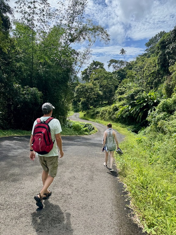 After taking the #5 city bus to the junction at the village of Concord, there is a 2 mile uphill trek to the falls. I enjoy this walk every time I take it. Concord is a lovely farming community, and the scenery is breathtaking…from cocoa trees, to beautiful deep red Sorrel out of which, a yummy juice is made, to baby pineapples with little purple flowers, to turmeric out drying on a…something…an I-don’t-know-what