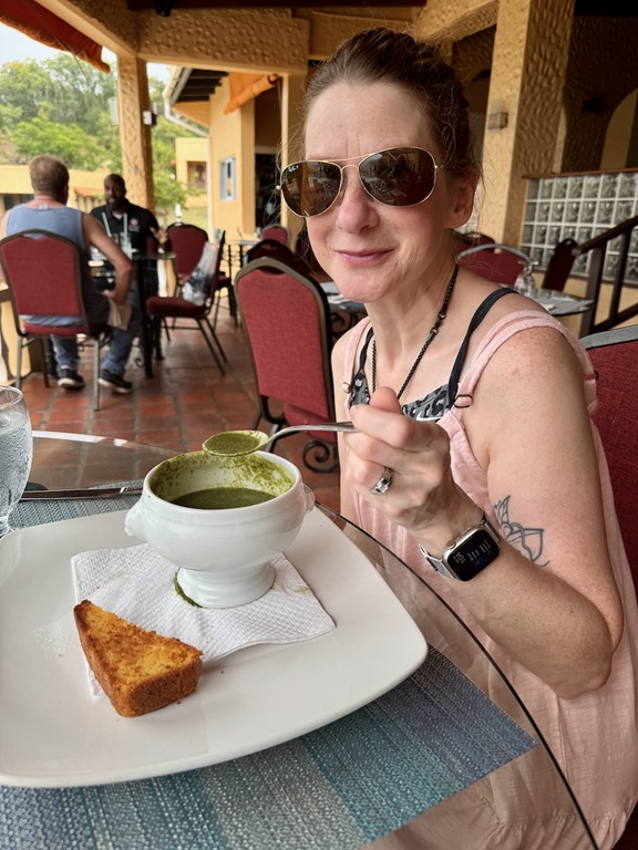 Of all the traditional Grenadian foods Jenny was able to try, the University Club’s callaloo soup was her favorite! She also liked doubles (a Trinidadian delicacy that a lady sells outside the boatyard every Monday through Friday). She didn’t care much for the roti she ordered for lunch at the University Club, but that problem was solved with a switcheroo of our entrée’s. She liked what I ordered (my go-to meal at the UC), grilled swordfish tacos!