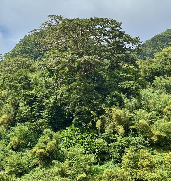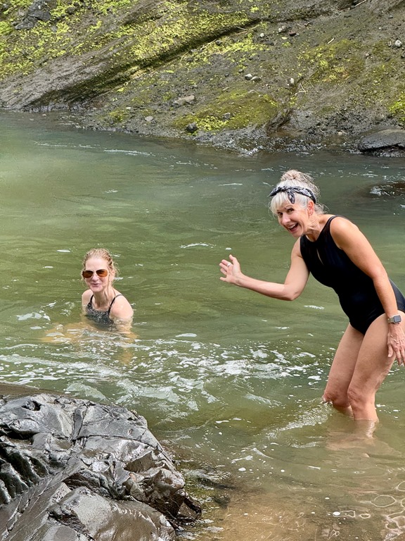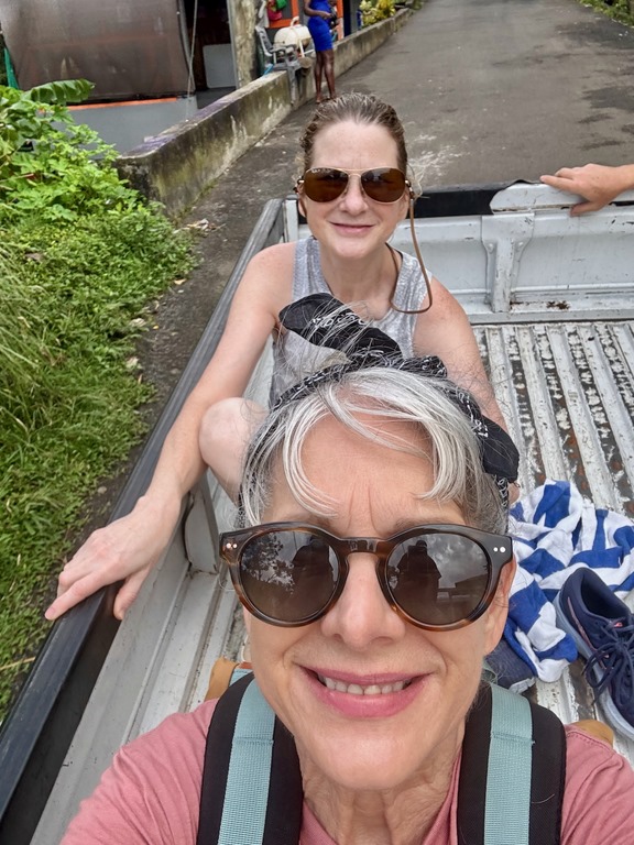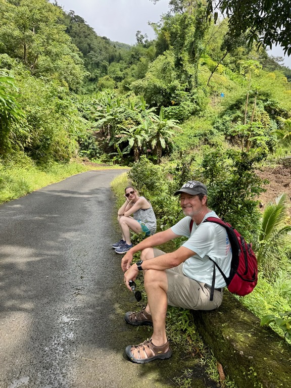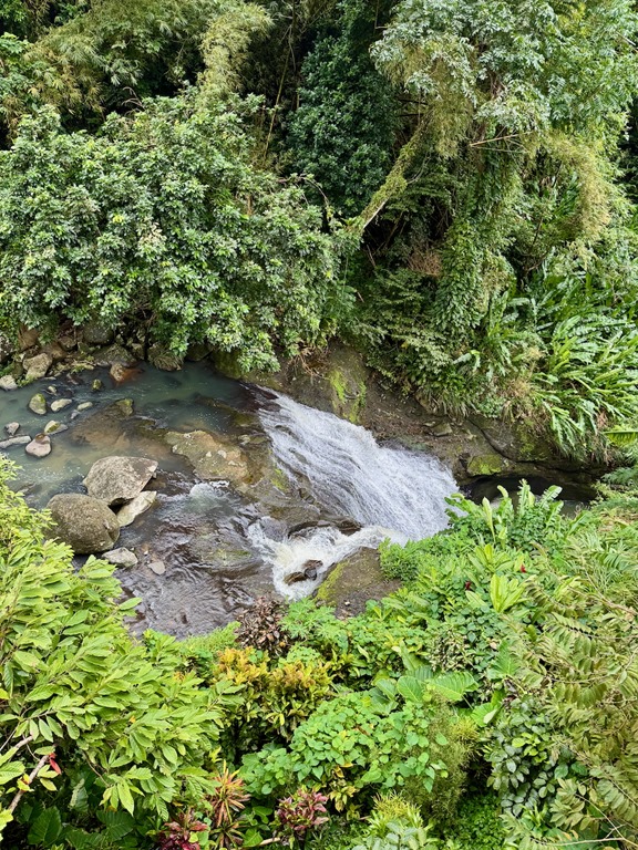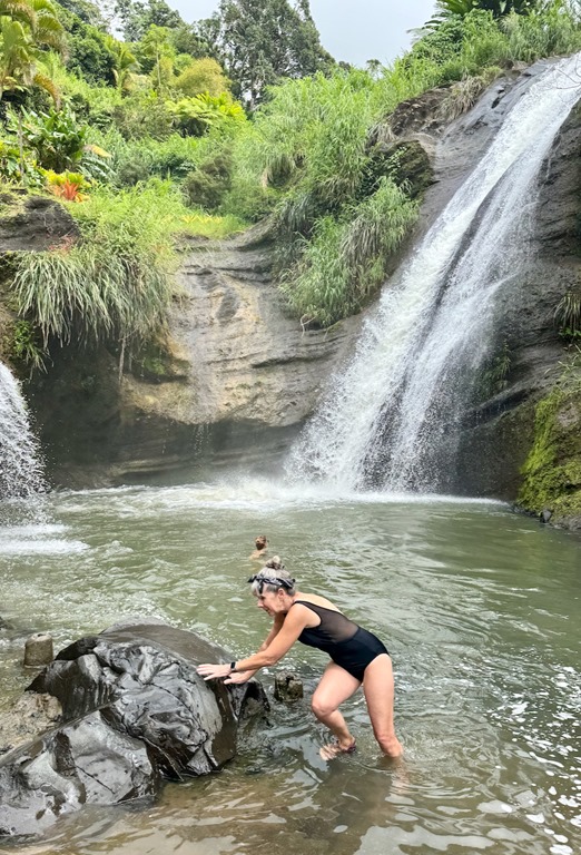 In keeping with the theme of Jenny’s visit to Nancy Lu being unique to other guests’ experience, we were unable to hike back to the less visited Fountainebleau Fall. The river was very swift and the ground was very slick due to so much rain, lately. We hiked back as far as we thought was prudent, and then we went back to Concord Falls where only Jenny was tough enough to brave the cold water. Then it was back down to Concord Junction to catch the #5 bus back to downtown St. George’s…