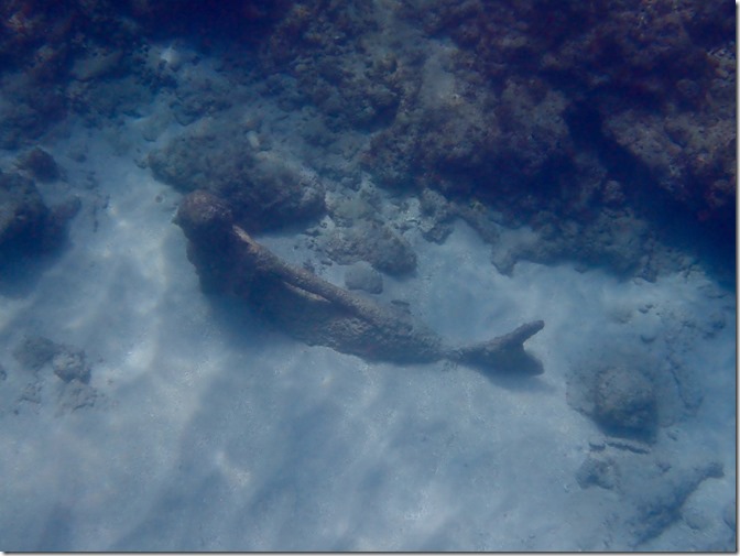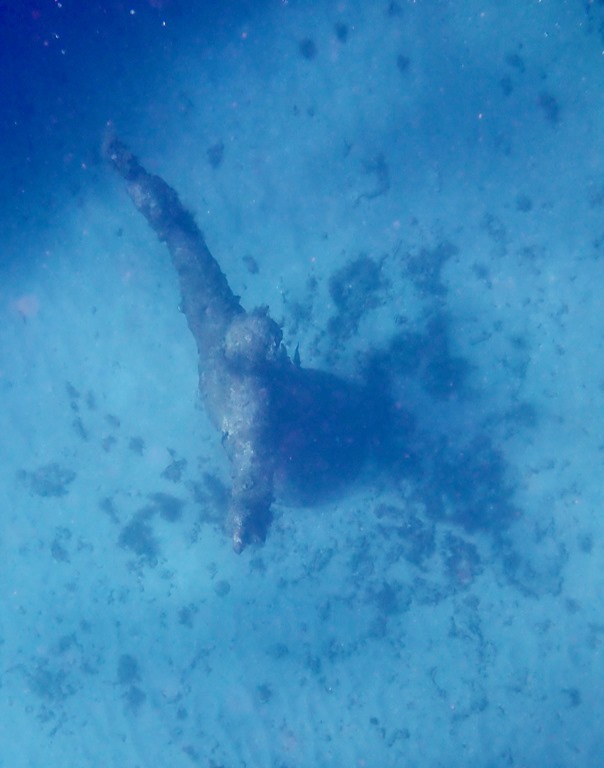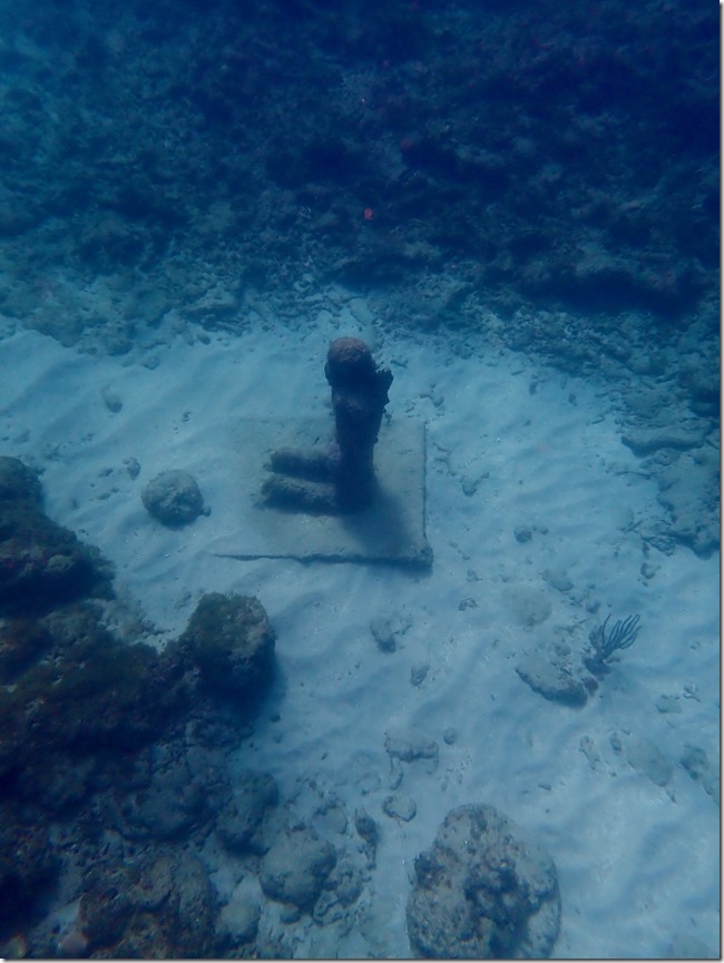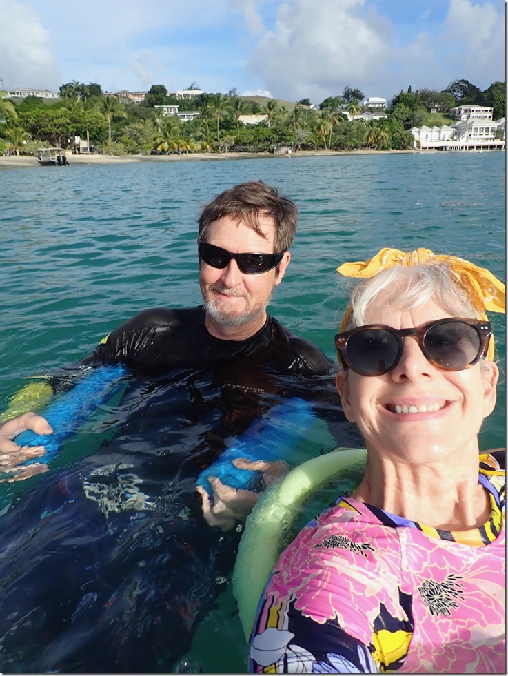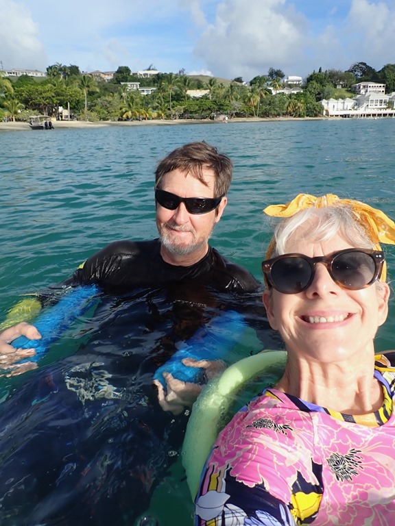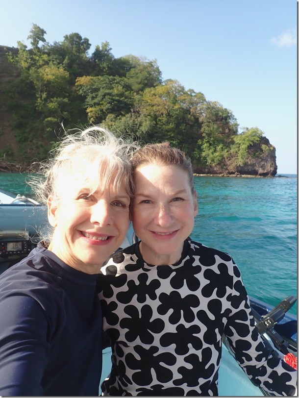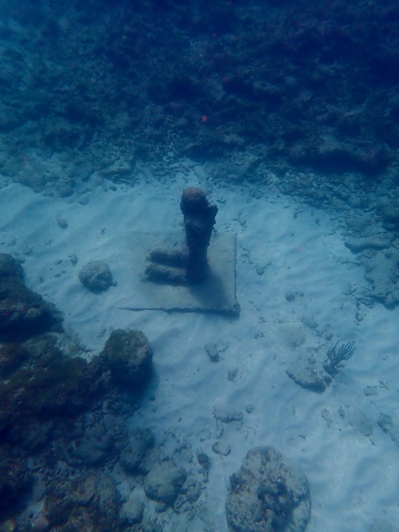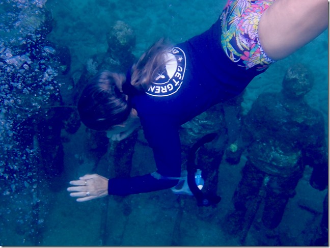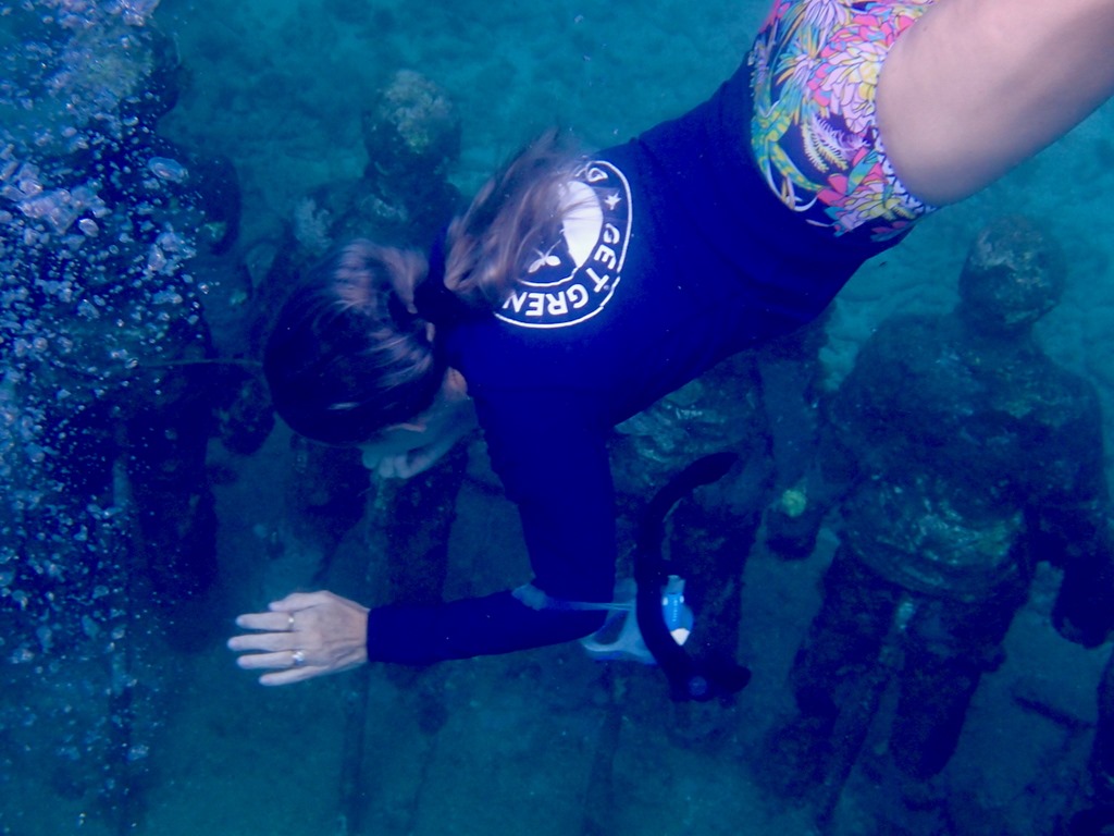 The next day, we donned our rash guards and did something else no other visitor has ever done…We went on a guided snorkel tour with Scuba West Indies to Flamingo Bay and Grenada Underwater Sculpture Park. Other guests have snorkeled with us in these places, but right off the back of Nancy Lu. For Jenny’s trip, we didn’t have time to sail there and back before she had to leave, so this was a good option. Mark dinghied us up to the head of Prickly Bay where Nancy Lu is moored to join the group for a quick powerboat ride to the snorkeling spot!
