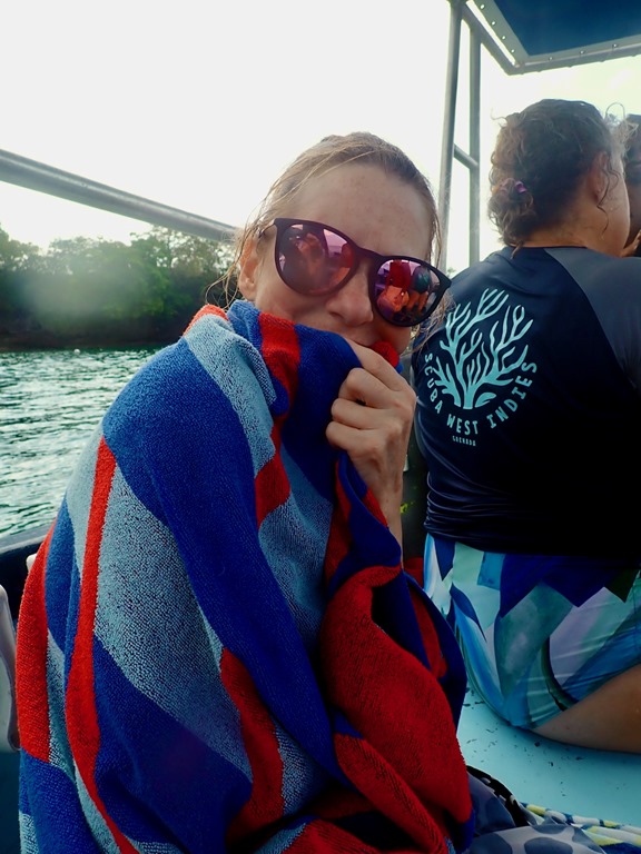 After all that snorkeling, Jenny was COLD on the way back to Prickly Bay.